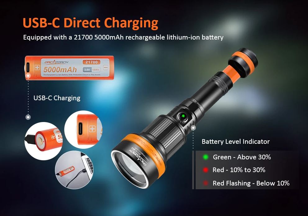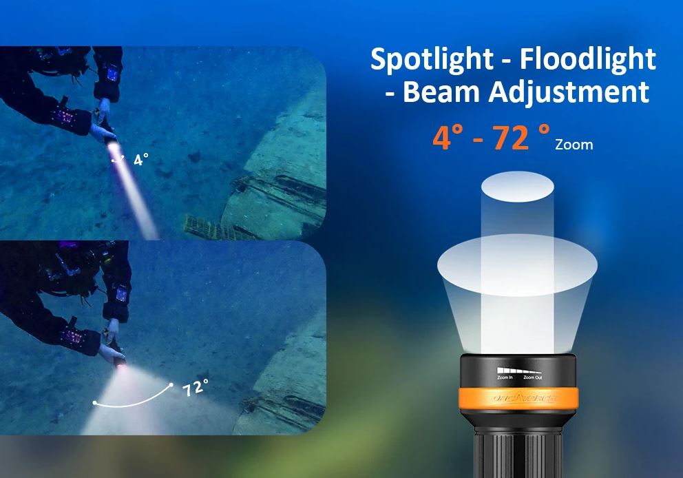 The all-new innovative OrcaTorch ZD710 MK2 zoomable dive flashlight meets your needs with an impressive maximum intensity of 212,500 cd and a versatile 4-72° adjustable beam angle.
